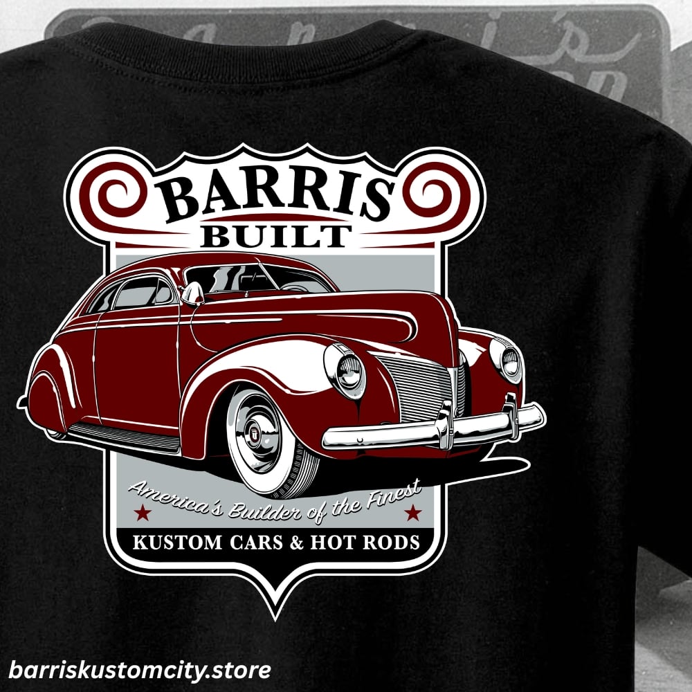 Barris Built Kustom Cars & Hot Rods Logo design ...the graphic is printed large on the back of the garment and also there is a smaller left chest version on the front of the garment