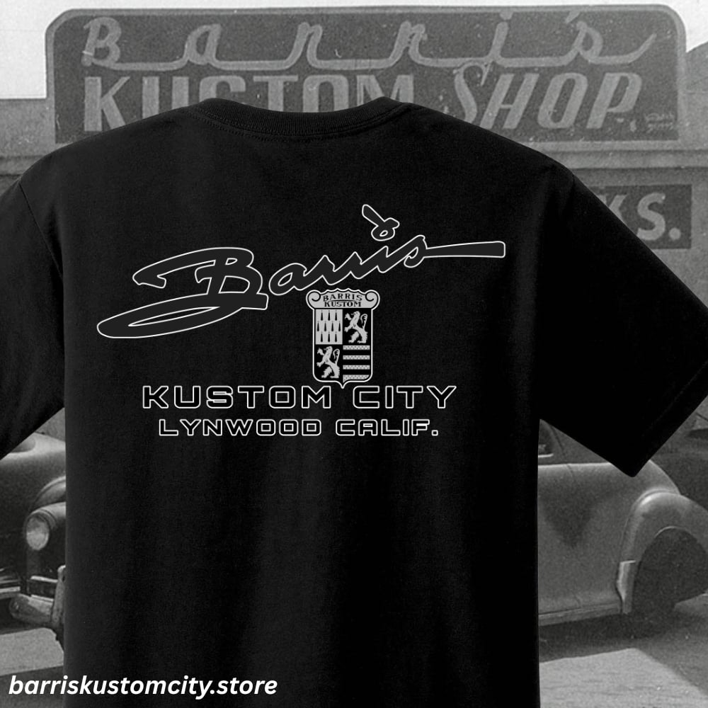 Large Graphic on the back and the Barris Kustom crest in Black and White on the front left chest.