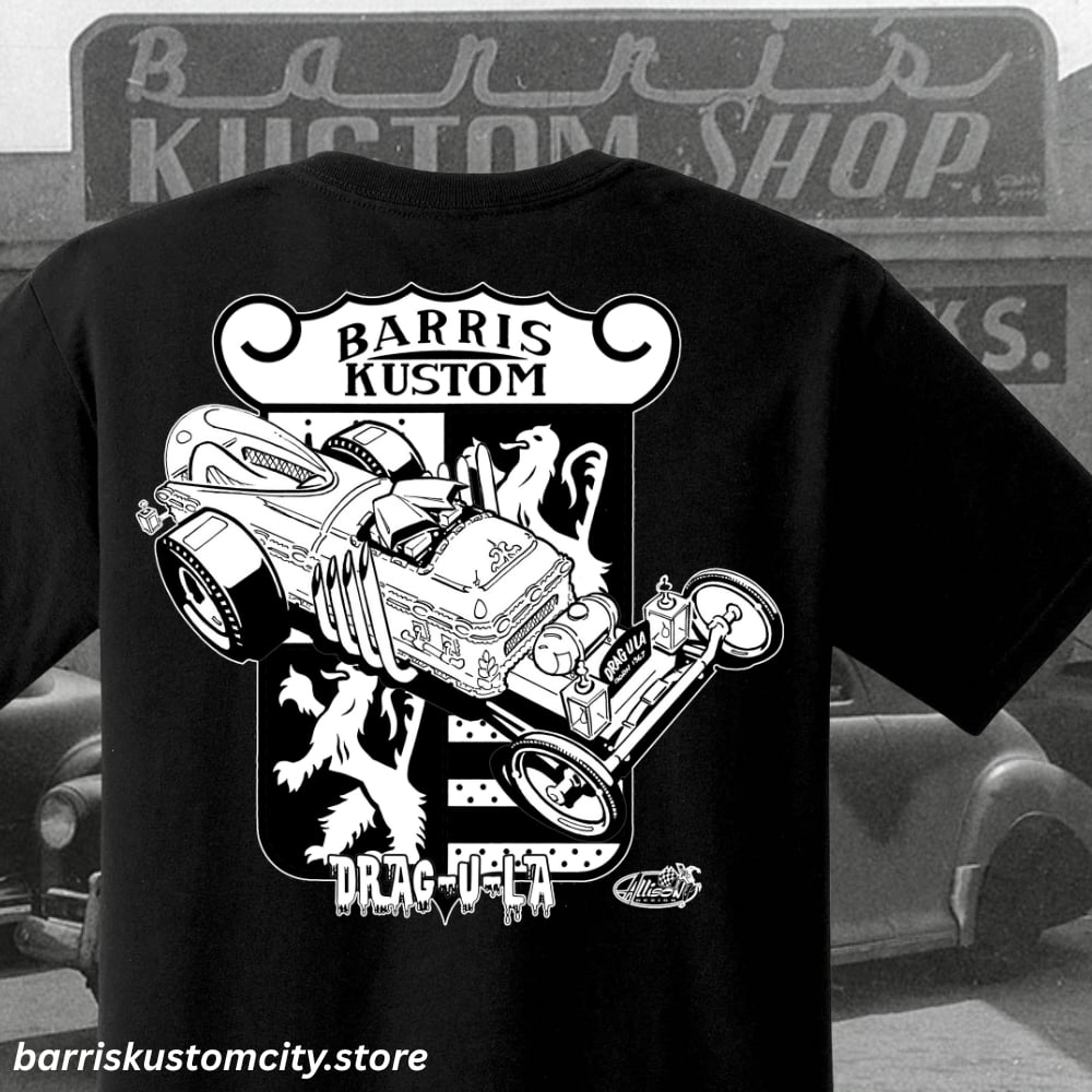 Large Graphi on the back and the Black and White version of the Barris Kustom crest on the front left chest of the garment.